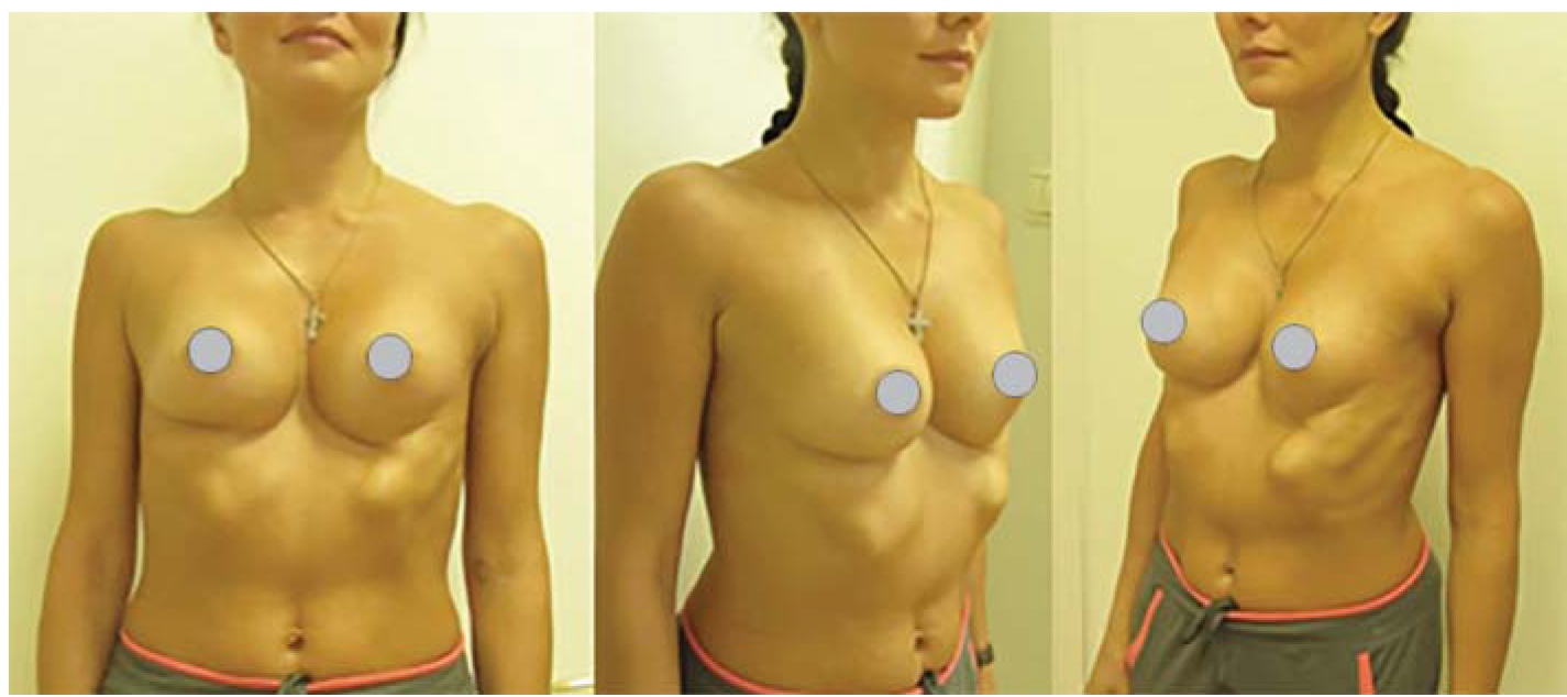 Спустя год после операции выполнили маммопластику с установкой силиконовых имплантов. Однако сохранялся выраженный косметический дефект передней грудной стенки.