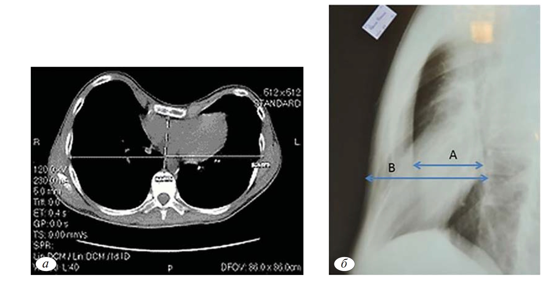 Рис. 2.а — КТ с определением индекса Haller и отношение по классификации Y. Park; б— определение индекса Gizycka.