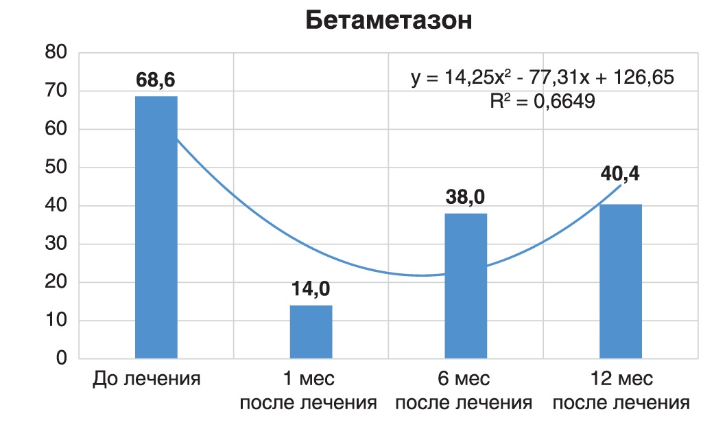 Пациенты получившие Бетаметазон показали наименьший уровень боли через 1 месяц, с постепенной тенденцией к уменьшению клинического эффекта через 6 месяцев и нарастанию клинических симптомов заболевания к 12 месяцам после лечения (рис. 1). 5 (10,0%) пациентов отметили отсутствие эффекта после 2-х кратного применения Бетаметазона на всех сроках наблюдения. Однако результаты, полученные в этой группе, спустя 12 мес. после лечения, все же оказались лучше, чем исходные данные (р≤0,05).