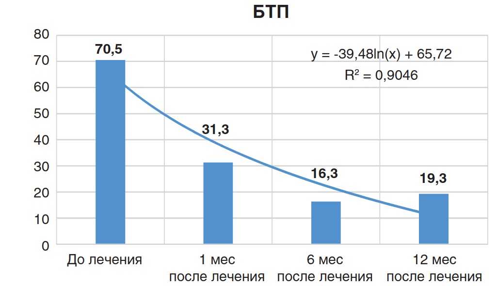 Наиболее выраженный клинический эффект через 12 месяцев после лечения выявлен у пациентов, получивших инъекции БТП. Причем результат сохранялся на протяжении всего периода наблюдения у 43 (86,0%) пациентов. Из полученных результатов видно, что эффект после применения БТП нарастает к 6 месяцам с незначительной тенденцией к уменьшению эффекта к 12 мес. (рис. 2). Следует отметить, что 7 (13,0%) респондентов этой группы отметили отсутствие эффекта на всех сроках наблюдения.