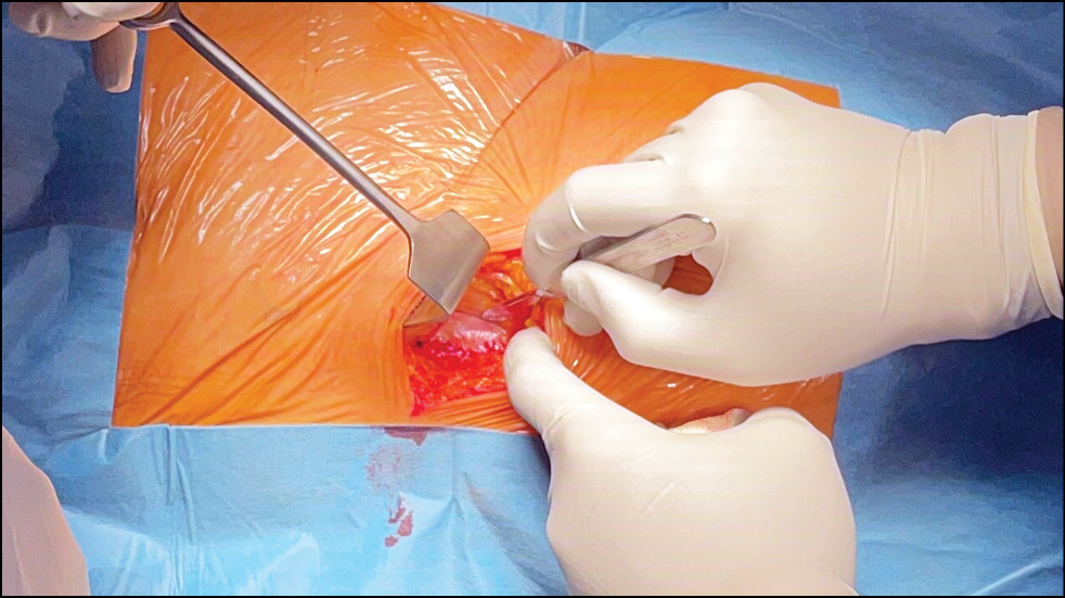 The surgical procedure began with anterior capsulotomy and head extraction (neck fillet and head removal) (Fig. 6–8), followed by inferior and superior capsulotomy. To perform inferior capsulotomy (or pubofemoral ligament release), the patient’s contralateral limb was placed over the contralateral limb to allow for slight external rotation. This allowed for surgical intervention of the small acetabulum and pubic–femoral ligament. For upper capsulotomy, the leg is positioned neutrally, and the bone hook is attached to the dense posteromedial region of the femur below the fibula (calcar femorale). This allows the femur to be pulled laterally and anteriorly, enabling the operating surgeon to clearly define the moment of release completion.