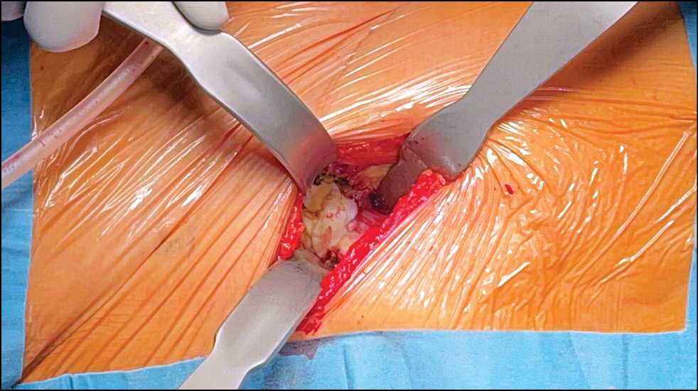 The patient was positioned supine on a standard surgical table with the legs draped loosely (Fig. 2). A skin incision was made in the pubic area, three fingerbreadths distal to the anterior superior iliac spine, with 2/3 of the incision lateral and 1/3 medial to the spine (Fig. 3). The tensegrity of the broad fascia in the abdomen was identified and incised (Fig. 4 and 5). After opening the space between the tensor of the broad fascia and rectus muscle, the lateral circumflex artery was coagulated.