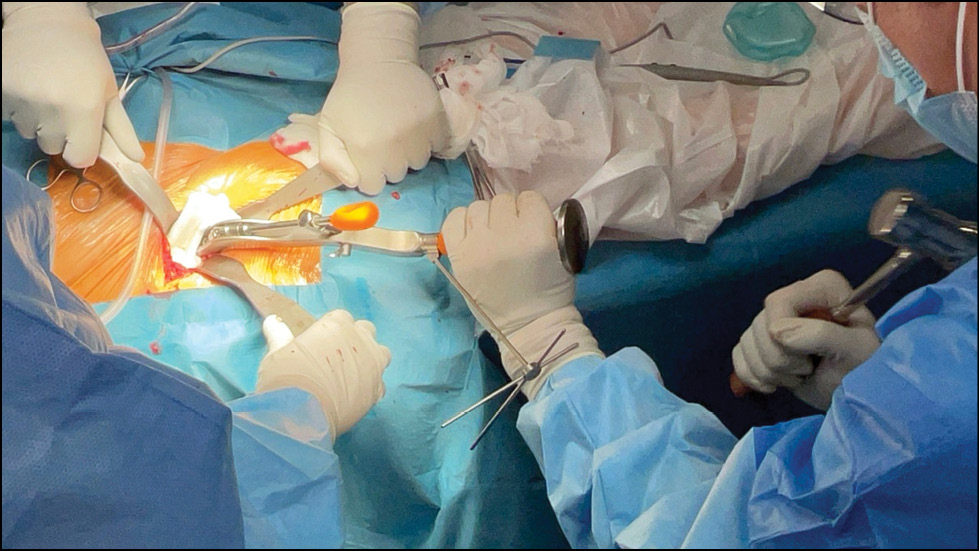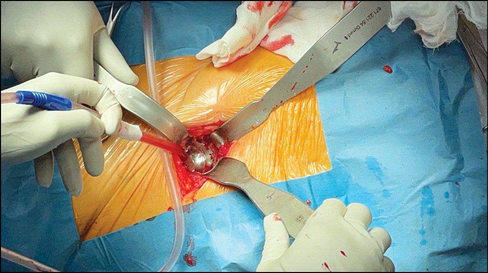 The use of DDA in HA allows surgery to be performed on any standard orthopedic table without significant limitations (Fig. 1). Thus, in inferior and superior capsulotomy of the hip joint in “position no. 4,” external rotation is conducted and the operated limb is brought under the contralateral limb. This approach enables surgery without the need for a specialized orthopedic table and avoids the need for hip hyperextension. After medial and lateral capsulotomy, a retractor is used to translate the hip into the surgical wound.