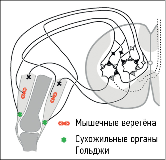 - сухожильные органы Гольджи — рецепторы системы регуляции напряжения мышцы;