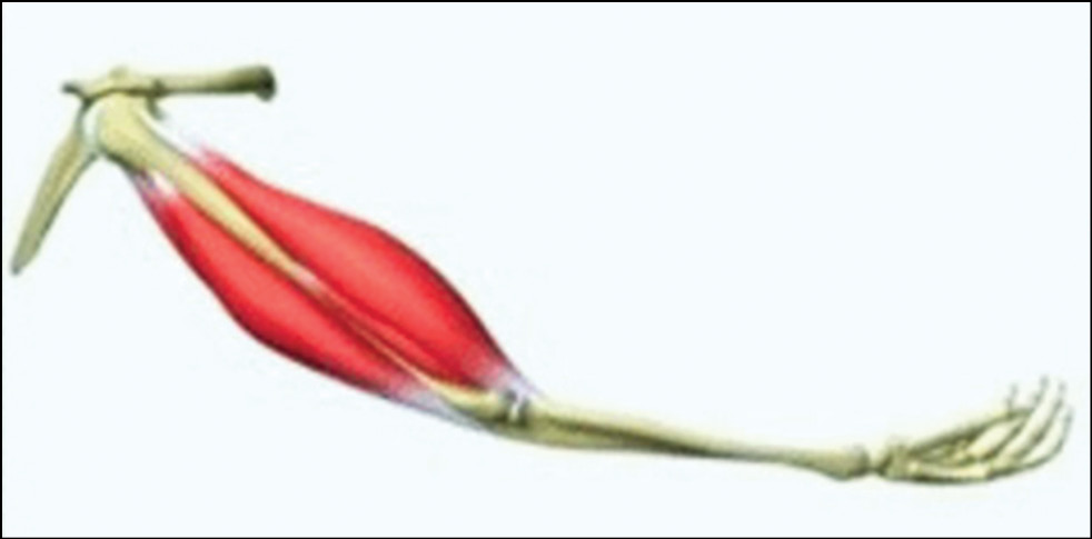 Двуглавая мышца плеча в данной биокинетической цепи формирует вектор силы, направленный от места прикрепления общего сухожилия на бугристости лучевой кости к месту прикрепления сухожилия короткой головки на клювовидном отростке лопатки [16, 31, 32].