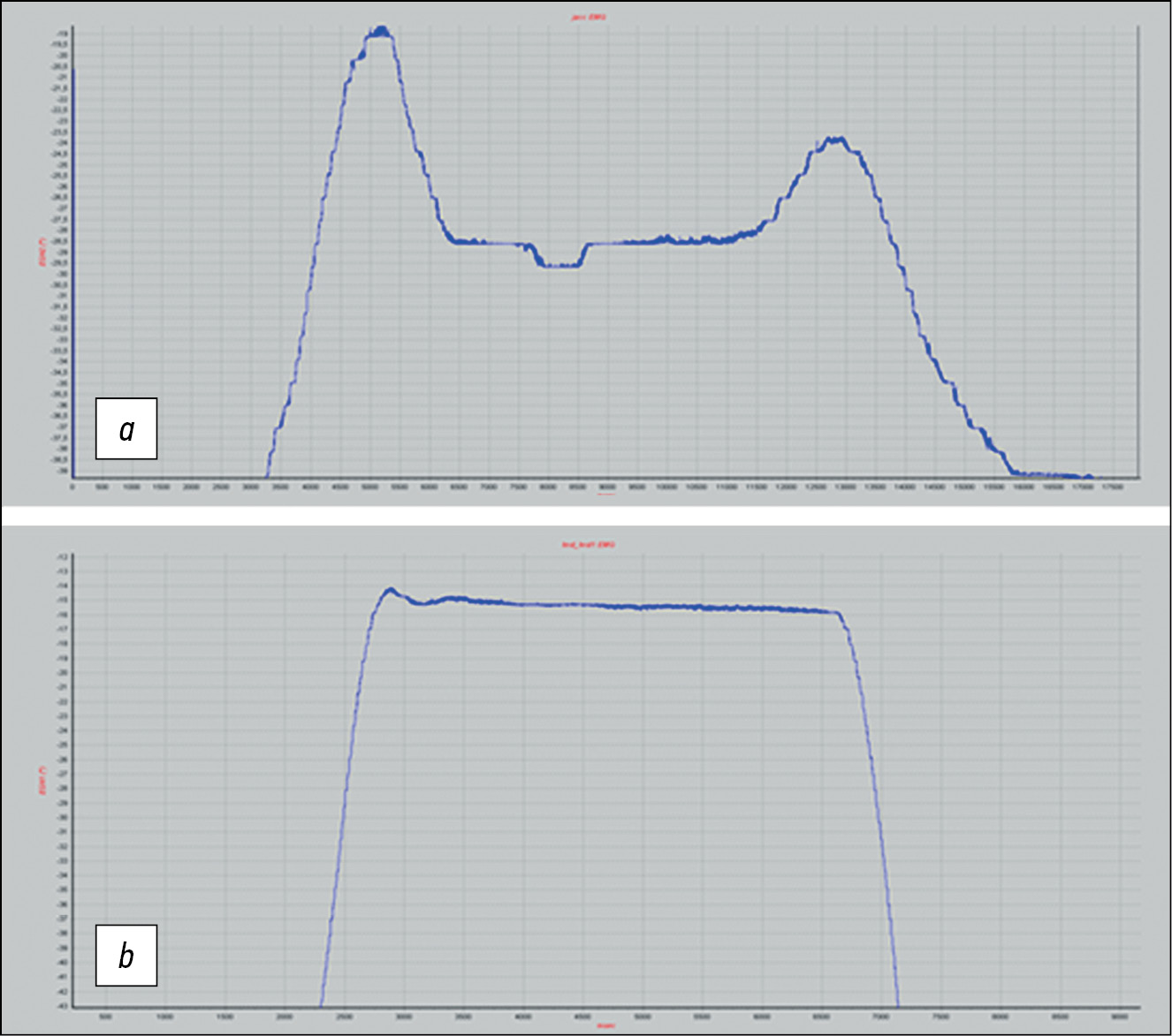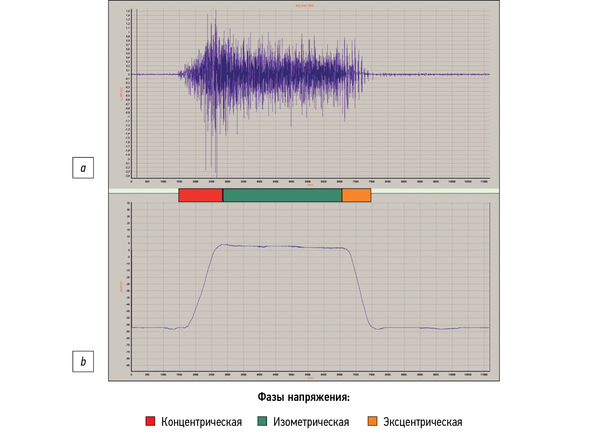 Рис. 5. Пример протокола обработки полученных данных: a — электромиография m. deltoideus, b — гониограмма (отведение).