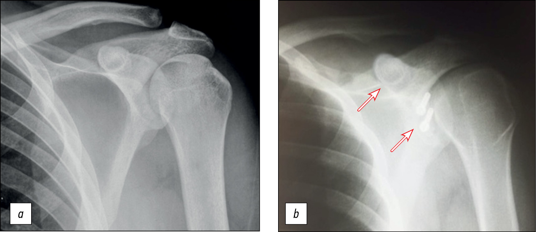 Рис. 15. Рентгенография правого плечевого сустава: а — до операции, b — через 6 месяцев после неё.