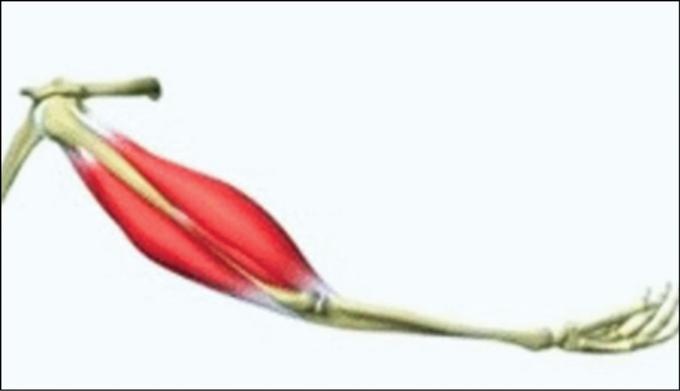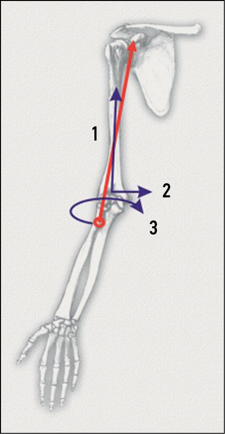 In this biokinetic chain, the biceps brachii forms a force vector directed from the attachment site of the common tendon on the tuberosity of the radius to the attachment site of the short-head tendon on the clavicular process of the scapula [16, 31, 32].