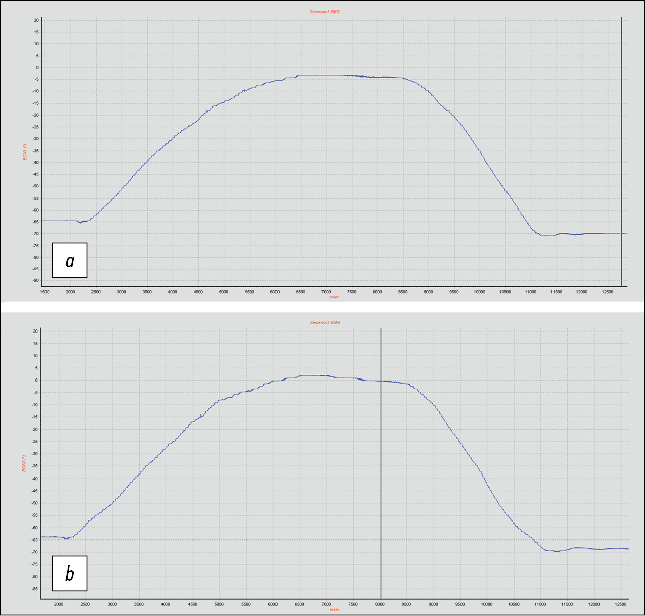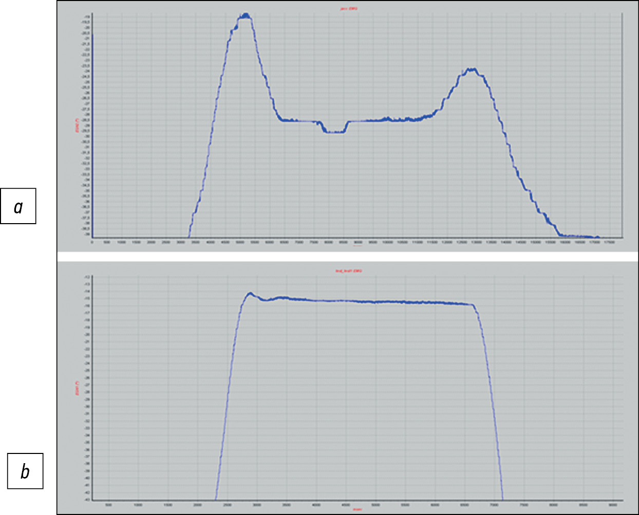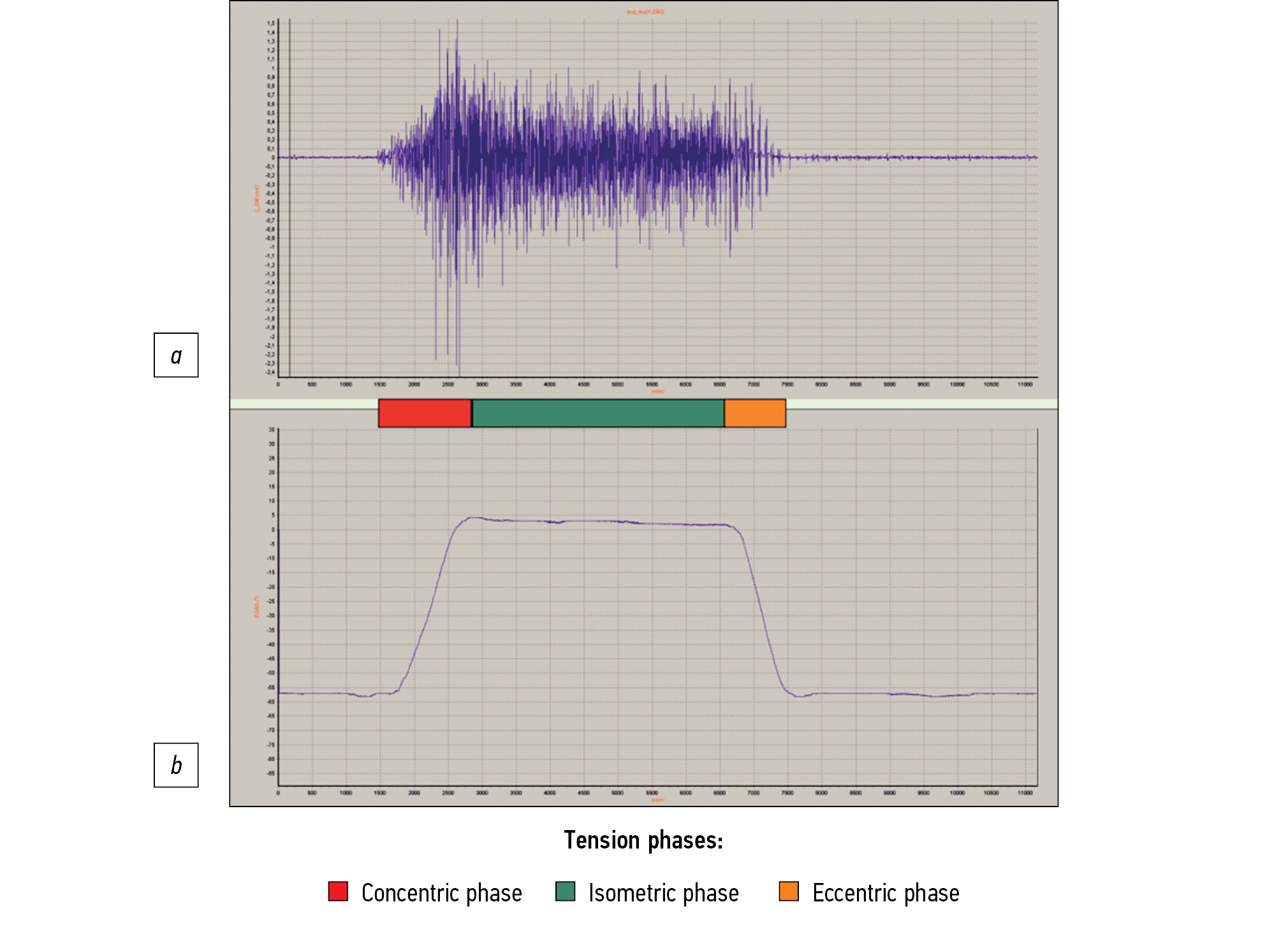 Fig. 5. An example of a protocol for processing the obtained data: a — electromyography of m. deltoideus, b — goniogram (lead).