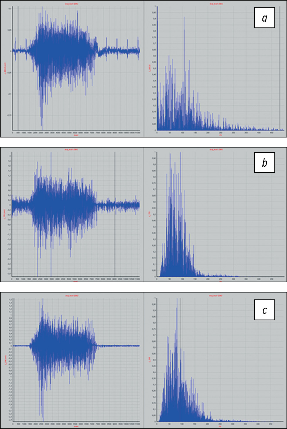 Fig. 7. Shoulder test, normal indicators: a — spectrogram of m. deltoideus, b — spectrogram of m. trapezius, c — spectrogram of m. biceps [11, 21, 22].