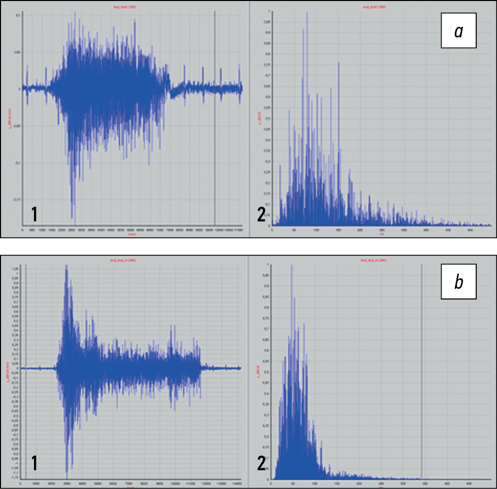 Fig. 8. Digital spectral analysis: a — shoulder abduction in the test: 1 — electromyography of m. biceps (average amplitude 42 μV), 2 — spectral density; b — forearm flexion: 1 — electromyography of m. biceps (average amplitude 237 μV), 2 — spectral density [8].