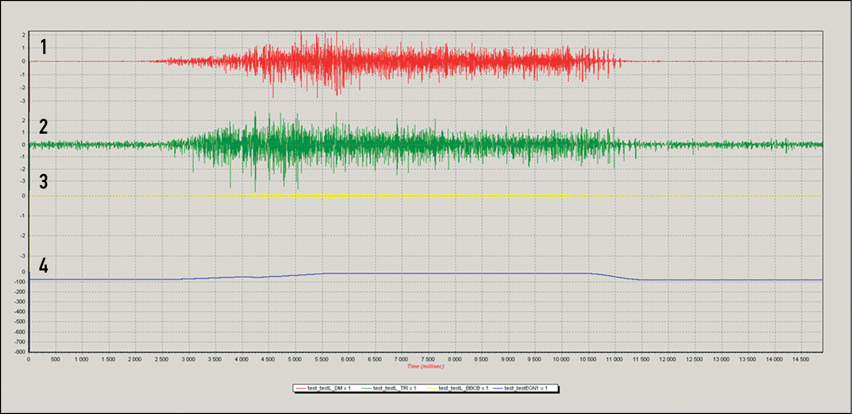 Fig. 9. 1 — electromyography of m. deltoideus (529 μV), 2 — electromyography of m. trapezius (481 μV), 3 — electromyography of m. biceps (42 μV), 4 — goniogram [9].