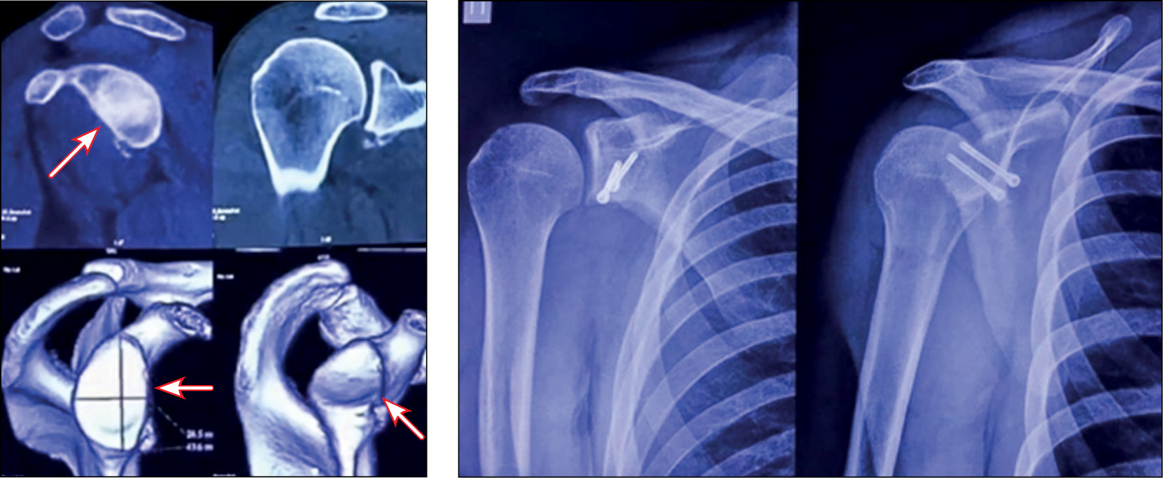 Fig. 10. Bone defect of the glenoid on preoperative computed tomography, control radiography 6 months after surgery.