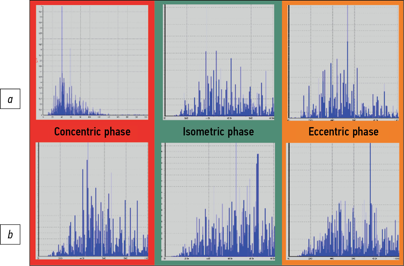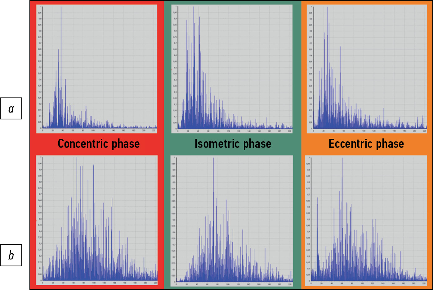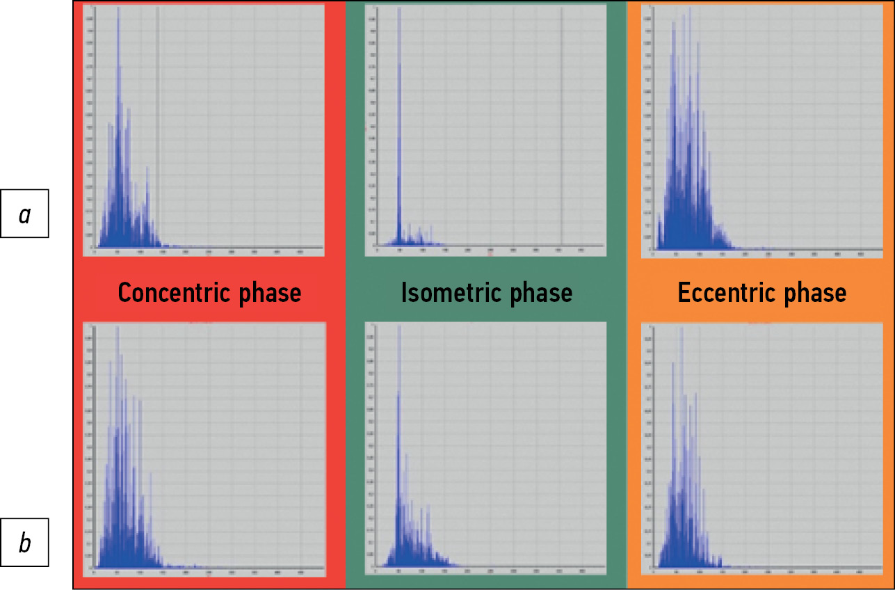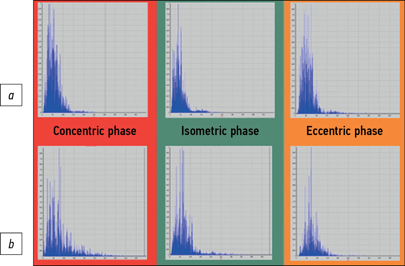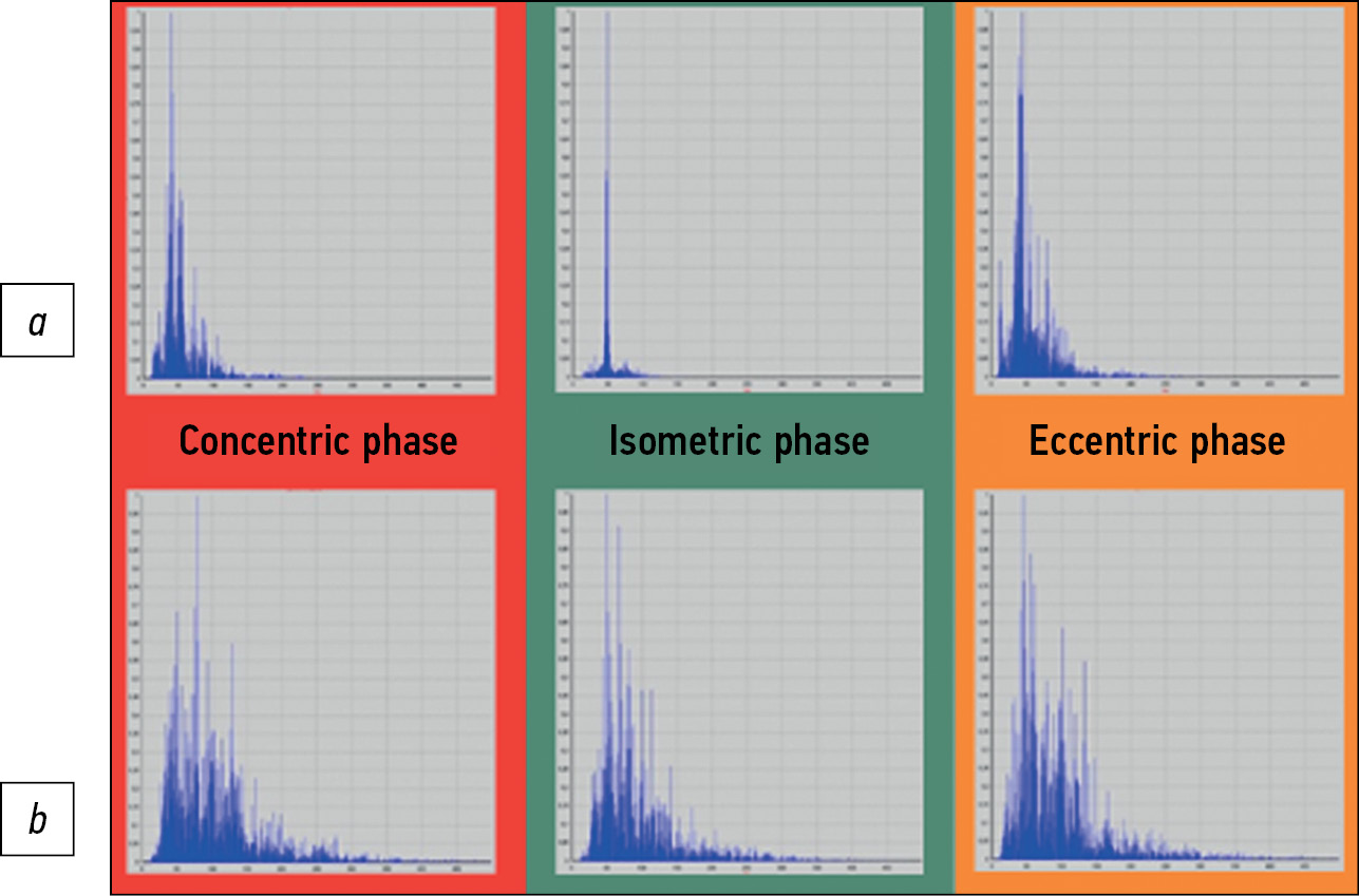 Maximum changes, such as spectrum narrowing, were also observed on the left side in the isometric phase. In the concentric and eccentric phases, slight differences from the right side were noted (Fig. 13).