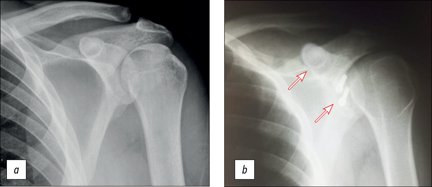 Fig. 15. X-ray of the right shoulder joint: a — before surgery, b — 6 months after it.
