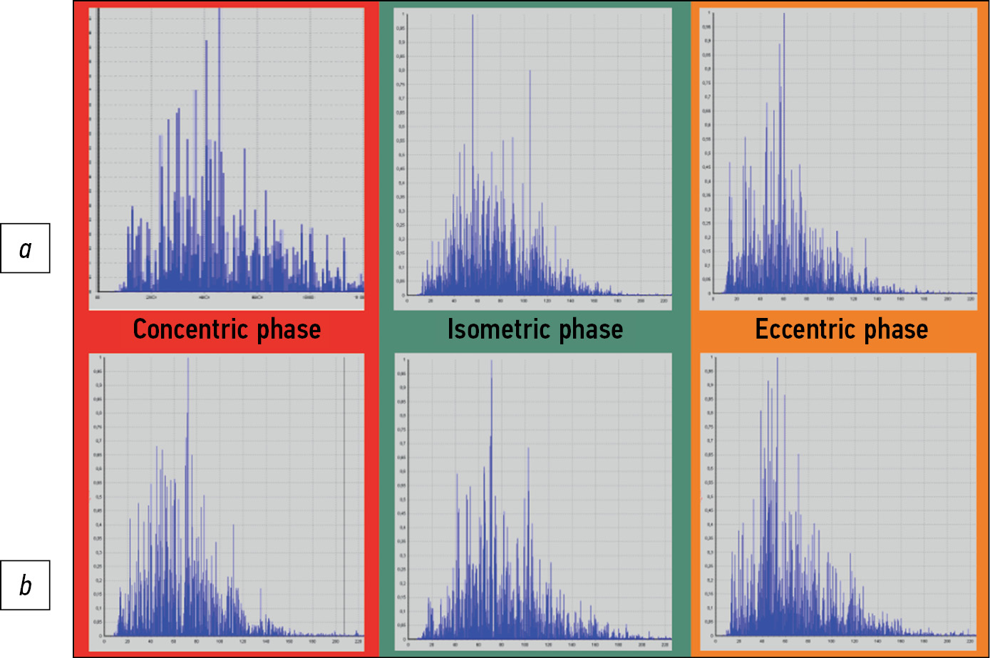 Fig. 18. Spectrograms of m. biceps: a — left hand, b — right hand.