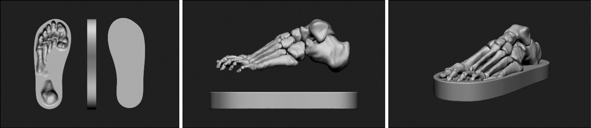 С целью обеспечения анатомически верной сборки костной системы стопы разработана и создана подложка для сборки медицинского симулятора. Изделие спроектировано в программе для трёхмерного моделирования ZBrush. На нижней стороне модели костной системы стопы создана сплошная поверхность, повторяющая геометрические формы нижней поверхности костей. В программе ZBrush размер полученной сплошной криволинейной поверхности увеличен на 5%. Затем при помощи функции булевой операции выполнен отпечаток нижней поверхности стопы. Полученная модель представляет собой пластину, повторяющую по контуру стопу человека, ограниченную с нижней стороны опорной плоскостью, а с верхней — углублениями для размещения костей стопы. При установке костей стопы в предназначенные для них ниши получилась анатомически верная модель костной системы стопы.