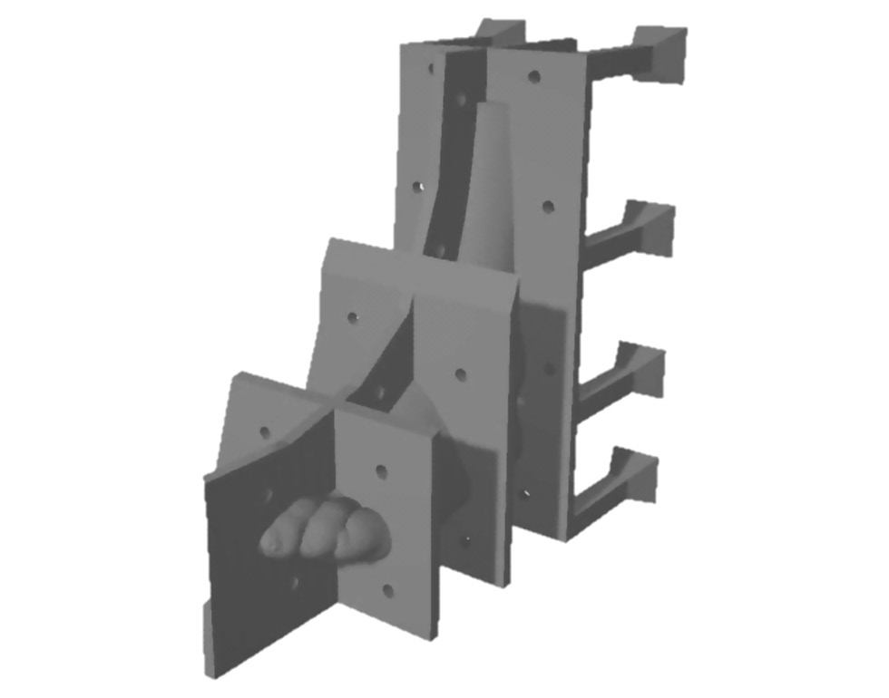 В ходе постепенного наращивания числа залитых ярусов симулятора обнаружено, что фаланги пальцев костной системы упираются в верхнюю часть формы. Для обеспечения правильности размещения костной системы в толще мягких тканей напечатан дополнительный ярус формы толщиной 7 мм, что позволило увеличить общую высоту формы и анатомически верно расположить костную систему относительно поверхности симулятора.
