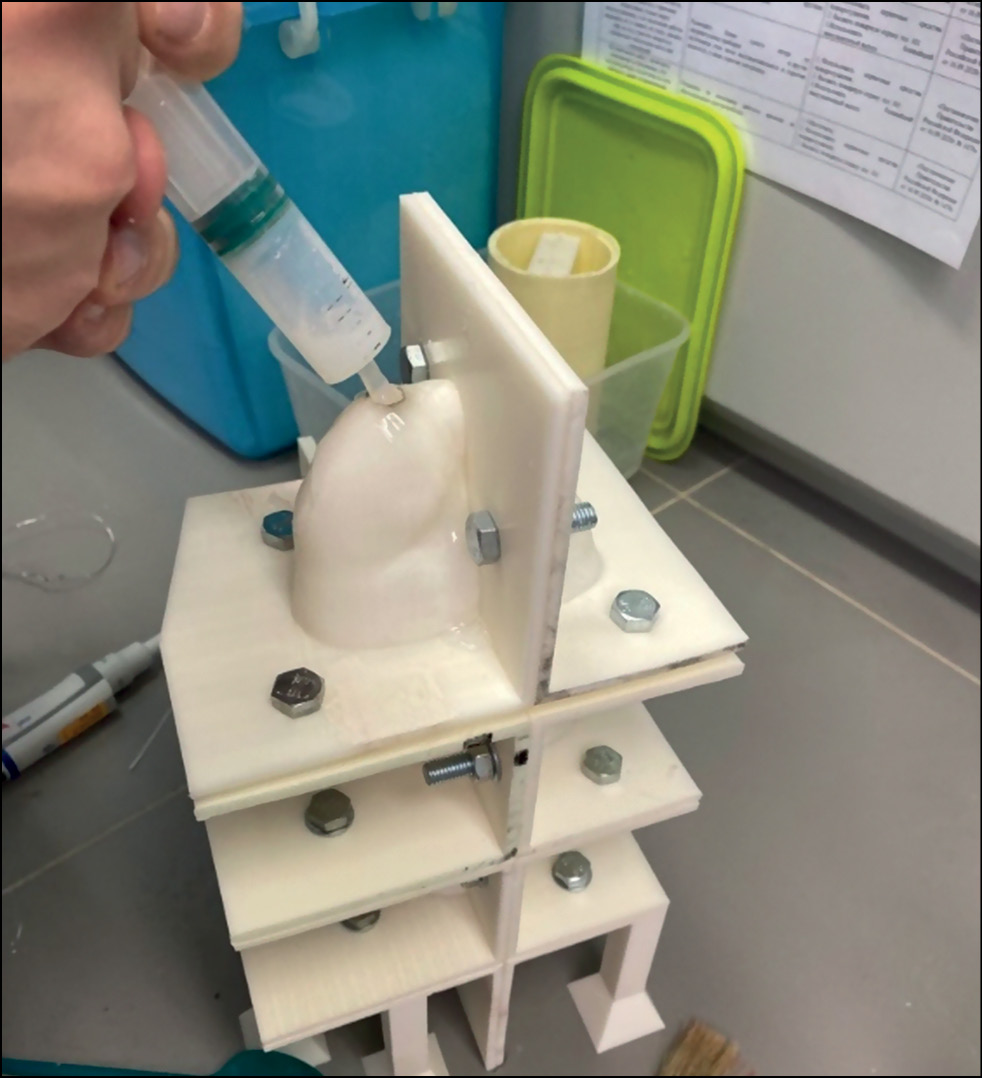 Заливка силиконового состава проводилась в лабораторных условиях при комнатной температуре (23–25 °С). Двухкомпонентный силиконовый состав производства SP-Polymer (Россия), отверждаемый катализатором на основе олова, обладает низкой вязкостью, коротким временем полного формования и длительным сроком эксплуатации. Для максимально достоверной имитации мягких тканей человека выбран силиконовый состав с твёрдостью по Шору А 30 единиц. Более мягкие и твёрдые образцы состава признаны неудовлетворительно передающими плотностные показатели мягких тканей. Компонент А перемешивался до однородности, переносился в лабораторный мерный стаканчик и точно дозировался (до 3-го знака после запятой) при помощи лабораторных весов. В массу компонента А (около 150 г) при помощи лабораторного дозатора вносился компонент Б — катализатор отверждения на основе олова — в соотношении 100:2. Смесь перемешивалась до однородности и заливалась в подготовленную форму.