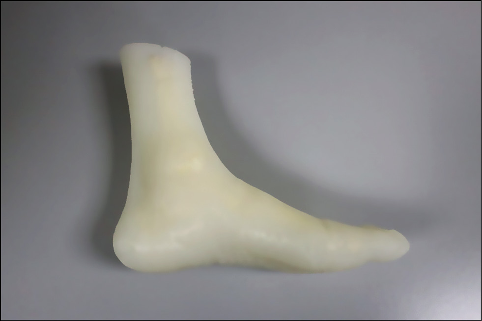 После того как заливочный состав принимал однородную структуру, удалялись крепления, осуществлялись разборка формы и отделение её от макета, а также пост-обработка изделия. В результате был получен готовый медицинский симулятор голеностопа для подготовки и обучения рентген-лаборантов со следующими параметрами: силиконовое исполнение — масса изделия 1,2 кг, длина 25,5 см, ширина 10 см, высота 23 см. Общий вид готового симулятора представлен на рис. 7.