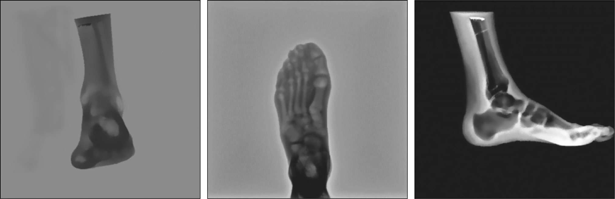 Далее с помощью рентгеновского аппарата проводили рентгенографию изготовленного медицинского симулятора в прямой, боковой и косой проекциях при тех же параметрах исследования, с которыми выполняются стандартные рентгеновские снимки стопы и голеностопного сустава у пациентов.