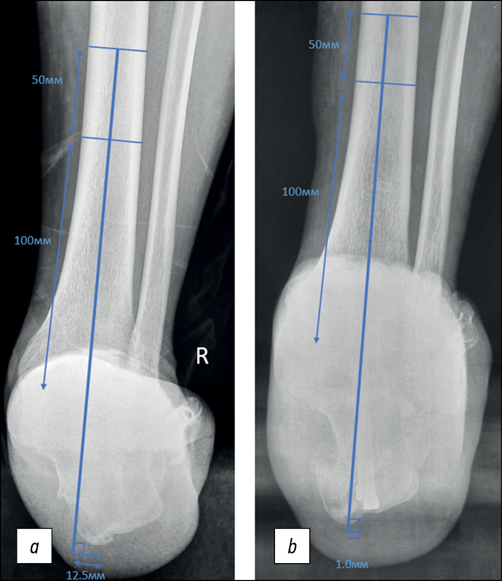 Рис. 1. (a) До- и (b) послеоперационный снимок. Результат коррекции оси заднего отдела стопы (hindfoot moment arm) Измерения на рентгенограммах, выполненных в проекции Зальцмана, определяются как кратчайшее расстояние от средней оси большеберцовой кости до самого дистального аспекта пяточной кости.