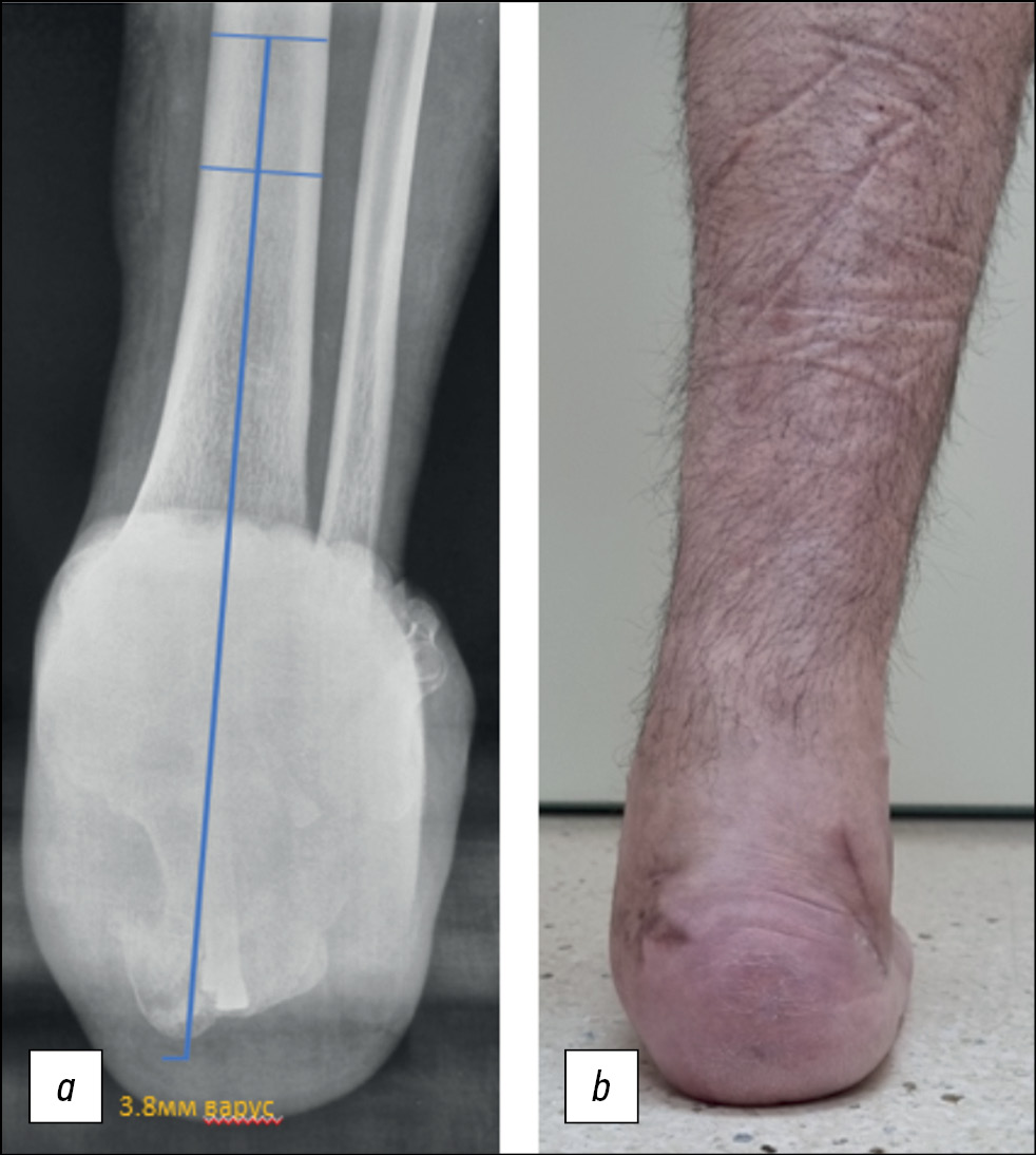 Рис. 2. Послеоперационное (a) рентгенологическое (проекция Зальцмана) и (b) клиническое обследование (положение стоя на оперированной стопе), коррекция деформации с тенденцией на варус 3,8 мм (умеренно-варусное положение) на рентгенологических измерениях. Клинически — ось ближе к нейтральной, без видимого варусного отклонения.