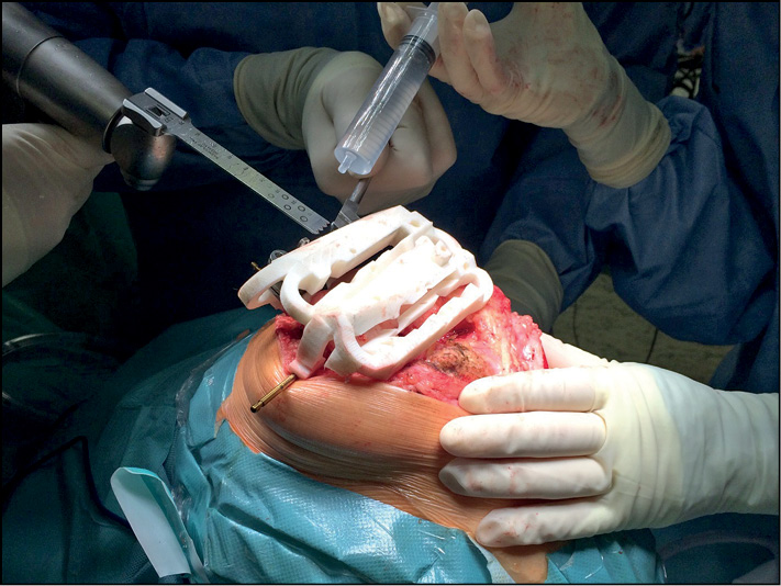 Рис. 3. Установка второго индивидуального резекционного блока на мыщелки большеберцовой кости.