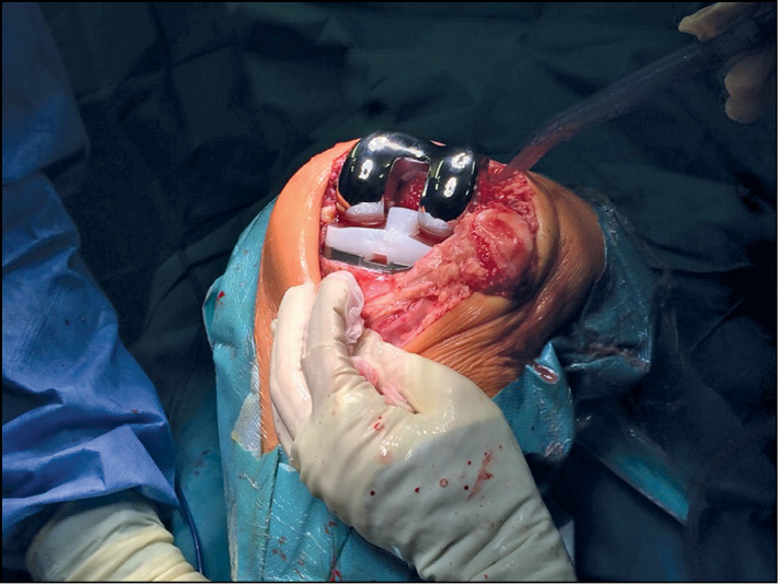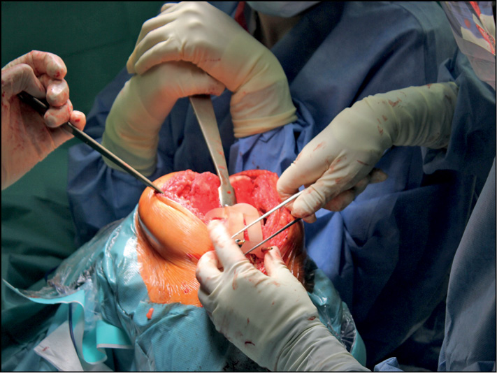 После установки ориентирующих пинов индивидуальный резекционный блок и два верхних пина удаляются. На оставшиеся пины устанавливается стандартный резекционный блок, и выполняется опил мыщелков большеберцовой кости. Верхние отверстия, проведённые ранее, служат ориентиром положения, ротации и размера большеберцового компонента. Затем проверяется ось, оценивается размер образованной щели между дистальными опилами бедренной и большеберцовой костей, баланс связочного аппарата и размер будущего вкладыша (рис. 4).