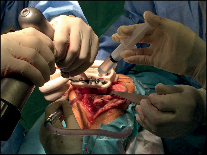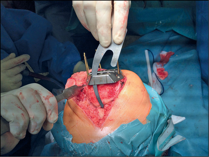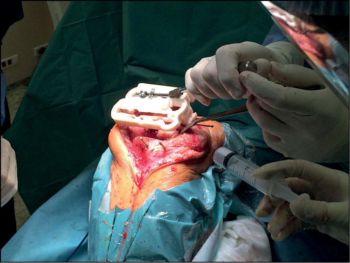 Fig. 3. Fixing the second individual resection block on the tibial condyles.