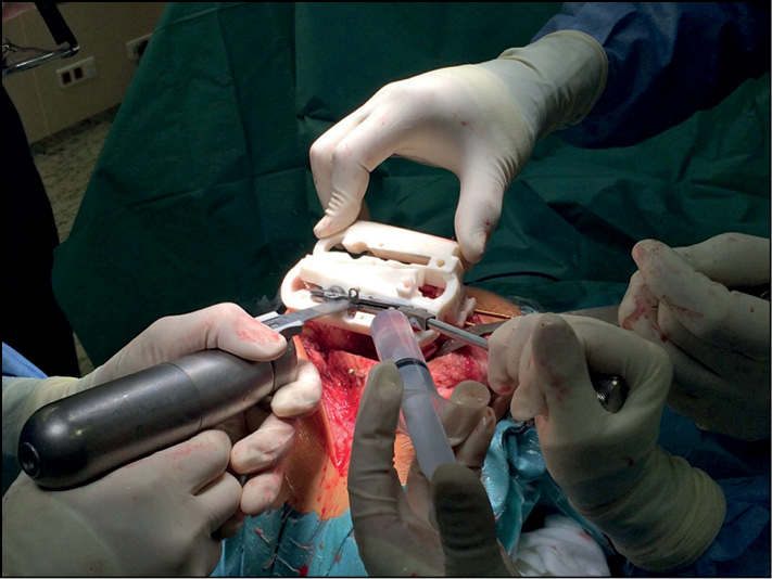 Наша комбинация «индивидуальный резекционный блок+инструмент — ограничитель лезвия пилы» позволяет сохранить чистоту раны, исключая попадание инородных тел, а также деформацию материала индивидуального резекционного блока во время колебания осцилляторной пилы.