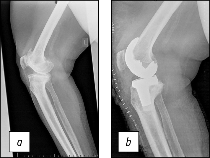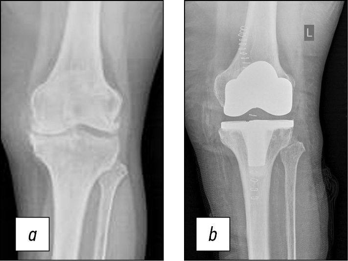 Больная Т., 72 года. Диагноз: деформирующий гонартроз левого коленного сустава 3-й степени с многоплоскостной деформацией и нарушением биологической оси конечности. Жалобы на выраженные боли в области левого коленного сустава, усиливающиеся во время ходьбы, ограничение движений в суставе, нарушение качества жизни. Клиническая картина: походка изменена. Контуры левого коленного сустава сглажены, биологическая деформация оси конечности. Пальпация болезненна в проекции суставных щелей. Движения из-за боли выраженно ограничены, сгибание 74°, разгибание 165°.