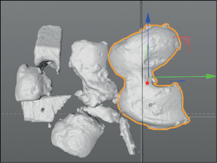 Рис. 13. Виртуальные модели удалённых костно-хрящевых фрагментов мыщелков коленного сустава после оперативного лечения.