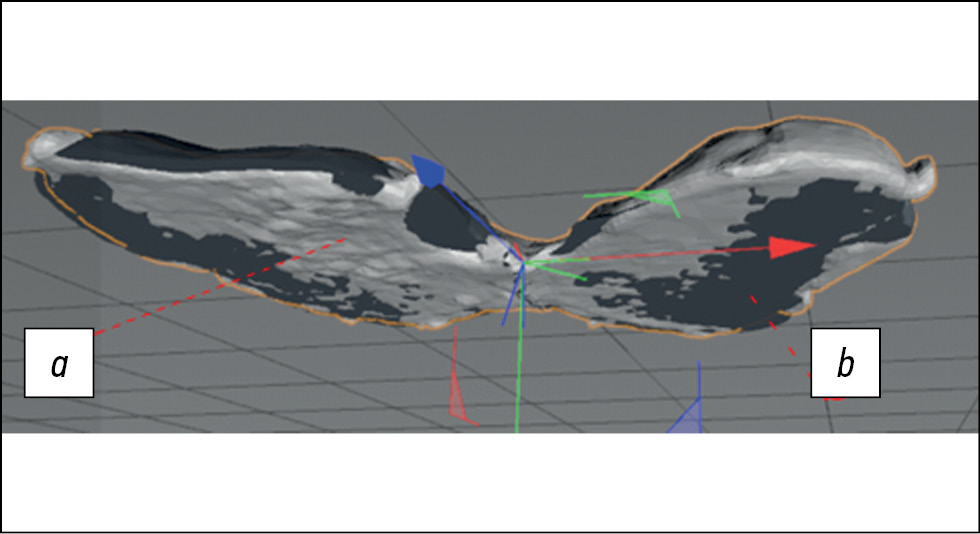 Рис. 14. Сопоставление полученных и ожидаемых результатов на примере дистального опила бедренной кости: а — результат сканирования после оперативного лечения; b — ожидаемый результат виртуального предоперационного планирования.