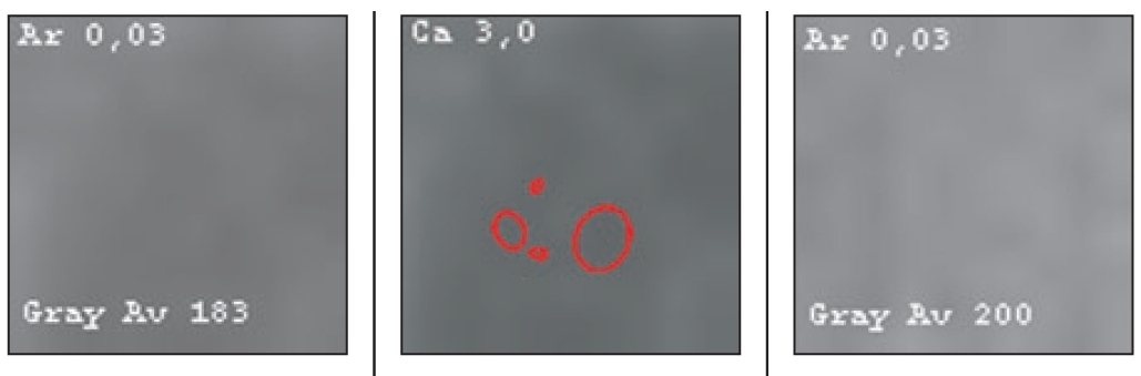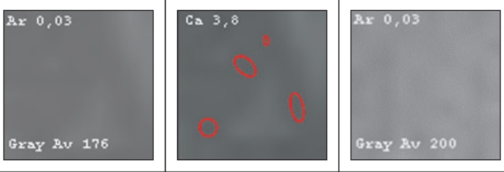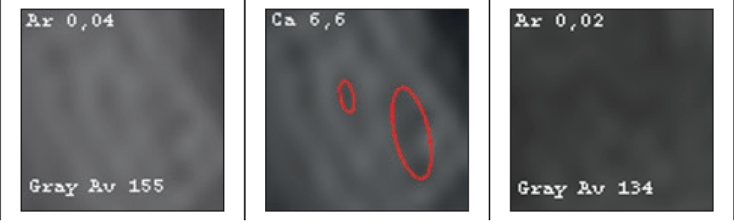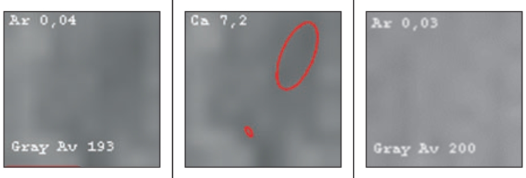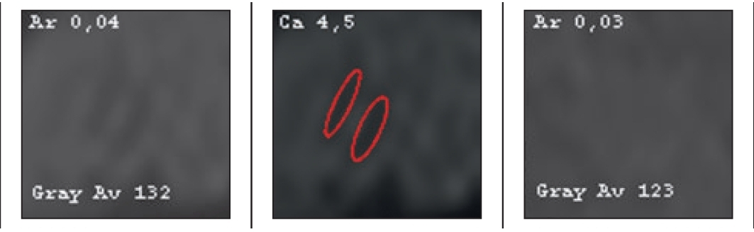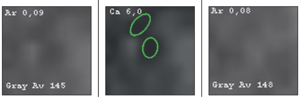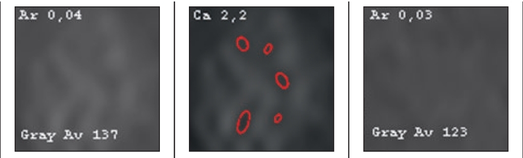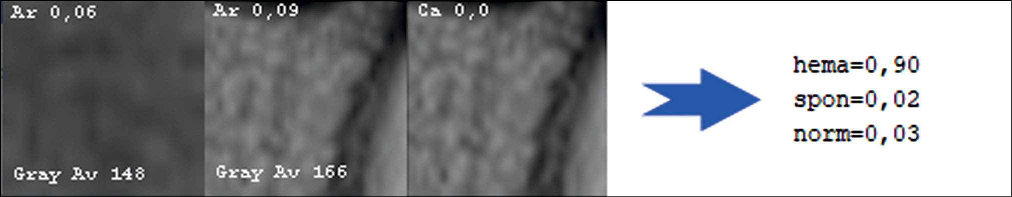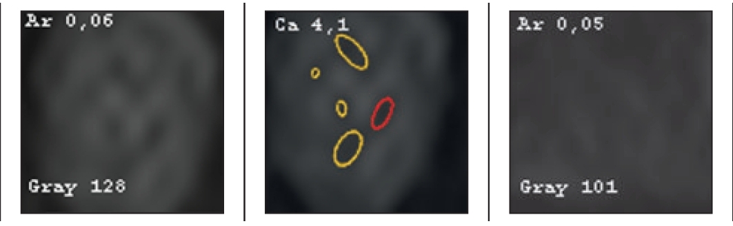 Figure 3 shows the result of object recognition from Fig. 1. The Arzela value was superior to that of the “normal” adjacent tissue (leftmost image), which is typical for a hemangioma. Additionally, the ratio of average intensity to “normal” tissue, equal to 1.15, was characteristic of hemangioma. The conditional probabilities of identifying the object were indicated, from which the hemangioma was recognized, with a conditional probability of 0.9 in shape.