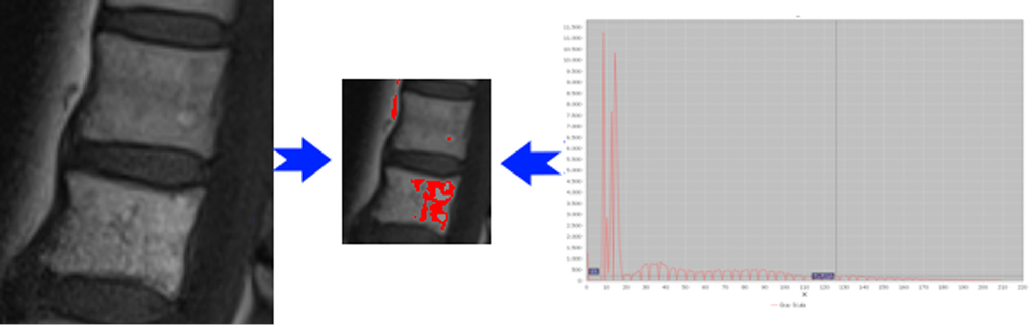 The image analysis operators used did not reveal significant differences in the differential signs of the presented edema and vertebral fat deposit cases. This is probably due to parallel processes, where areas of fatty degeneration with a reduced signal in STIR and uneven zones of subcortical osteosclerosis are determined against the subcortical peritrabecular edema (Fig. 4).