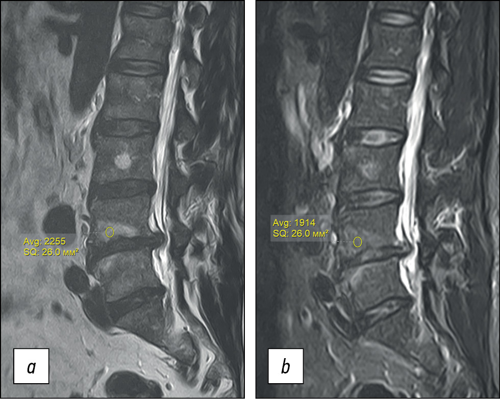 Fig. 4. MRI of the lumbar spine in the sagittal projection. T2WI, degenerative-dystrophic changes in a patient without an oncological history. a) Zones of heterogeneous subcortical edema are determined in the bodies of the vertebrae LIV, LV against the background of a herniated disc. b) In the STIR mode, the severity of edema appears to be reduced in relation to T2WI due to areas of fatty degeneration and subcortical sclerosis.