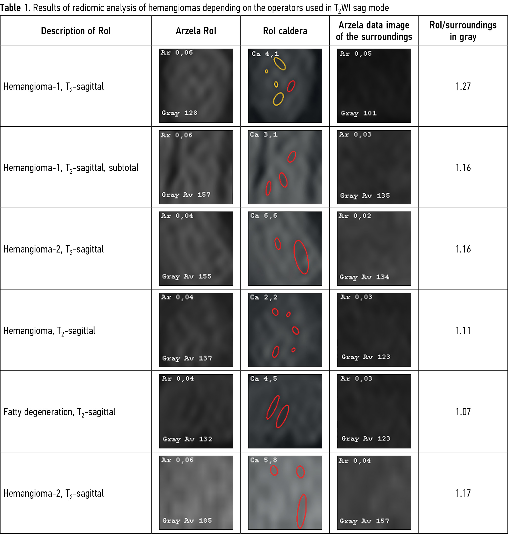 RESULTS: The main differential indicators for hemangioma, conditionally normal areas of the bone marrow, and metastatic foci have been established. The Arzela data image complexity operator was approximately 0.07 for hemangioma, approximately 0.05 for metastases (mts), and approximately 0.04 for vertebrae. The brightness histogram operator was approximately 1.12 for haemangioma and approximately 0.94 for mts. Regarding the difference between indicators, the difference is 20%–25%, between hemangioma and bone marrow and 35% between mts and bone marrow, which make it possible to effectively use these indicators together with other markers.