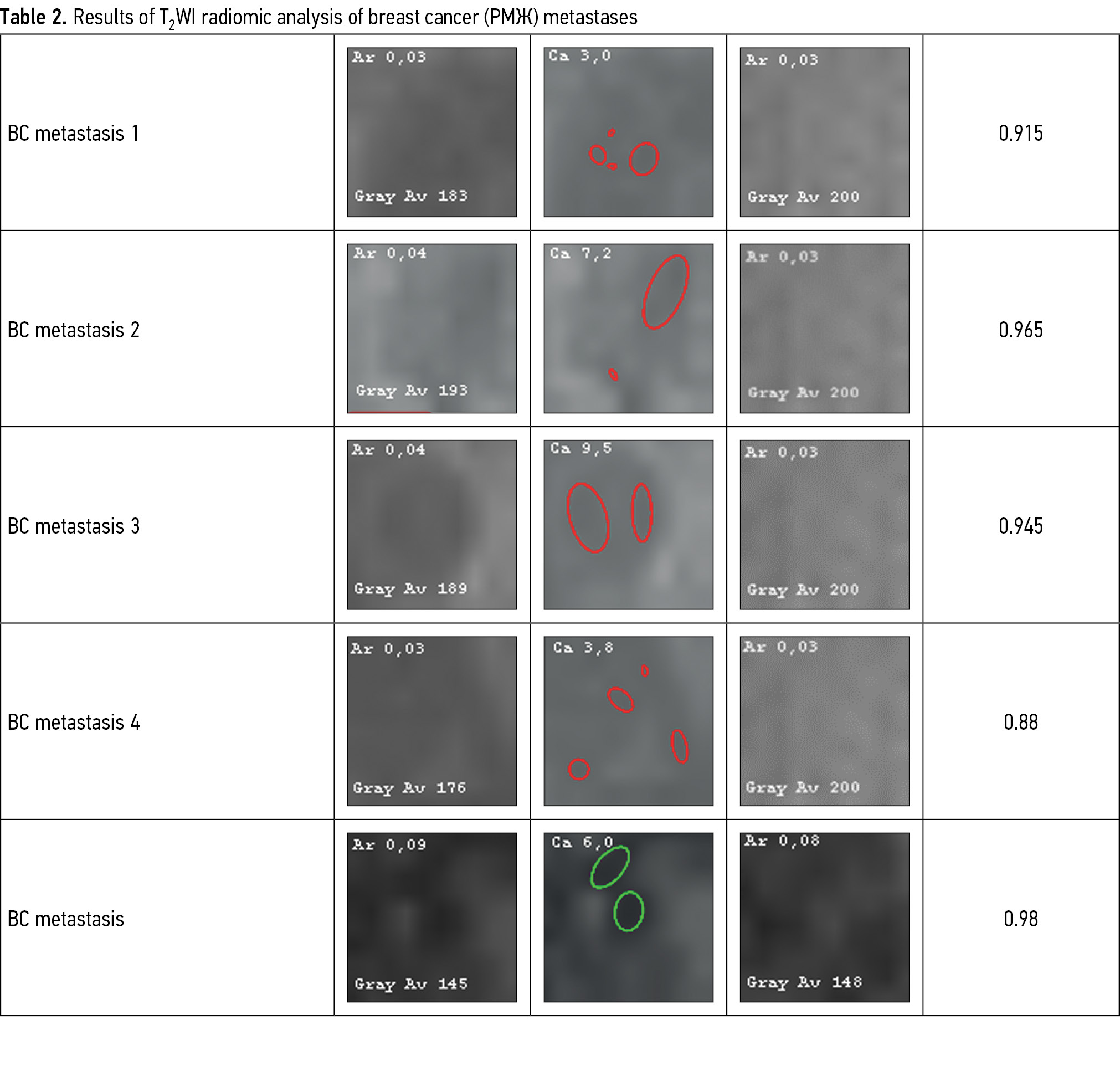 Table 2. Results of T2WI radiomic analysis of breast cancer (РМЖ) metastases