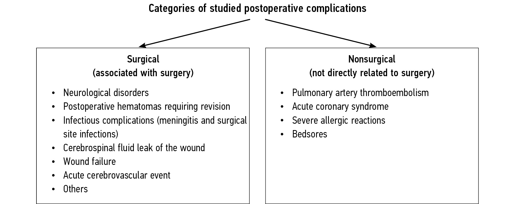 In 2009, Houkin et al. published the results of a study where adverse events were classified based on predictability and the possibility of their prevention [3]. In 2011, Landriel Ibañez et al., for the first time in neurosurgery, attempted to create a systemic specialized classification of complications. The authors defined any deviation from the normal course of the postoperative period within 30 days as a complication. They considered nonsurgical complications as adverse events not directly related to the surgery or surgical technique (e.g., pneumonia, gastrointestinal bleeding, and genitourinary system infections) [10]. However, this classification has not become widespread, and its potential universality has been subjected to evidence-based criticism in the professional community [1].