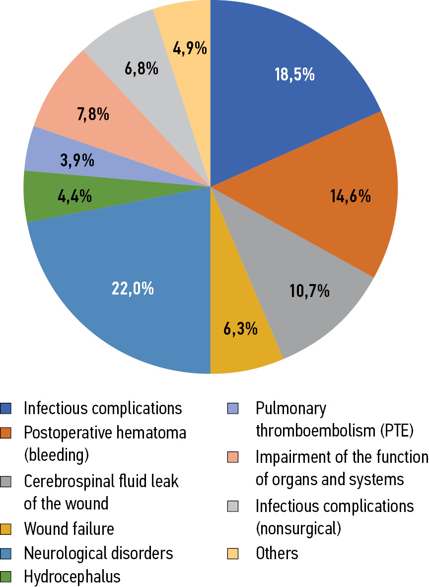 The analysis of annual reports of medical and diagnostic units from 2019 to 2020 showed that the average complication rate was 25–29 per 1,000 surgeries (2.5%–2.9%). The ratio of the incidence of the main types of registered complications is shown in Fig. 2. The largest proportion of complications was represented by infectious processes (associated or nonassociated with surgical intervention), an increase in neurologic deficit, postoperative bleeding (hematoma), and cerebrospinal fluid leak.