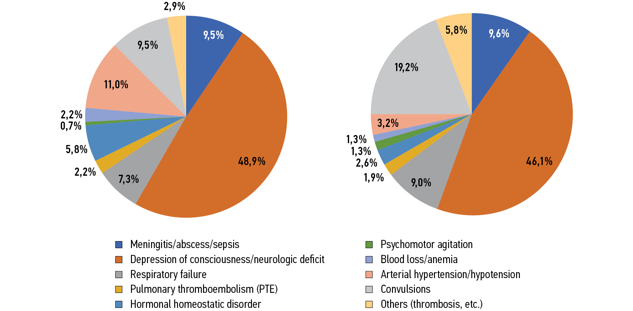 Unscheduled transfer from the clinical department to the ICU was one of the important indicators of the complicated course of the disease. In different years, this figure was 1.53%–1.69%. The most common causes of unscheduled transfers included depression of consciousness, neurologic deficit, intractable fluctuations in blood pressure, convulsive syndrome of varying severity, and inflammatory complications (meningitis, abscesses, and sepsis). The ratio of the frequency of the main reasons for transfers to the ICU is shown in Fig. 4.
