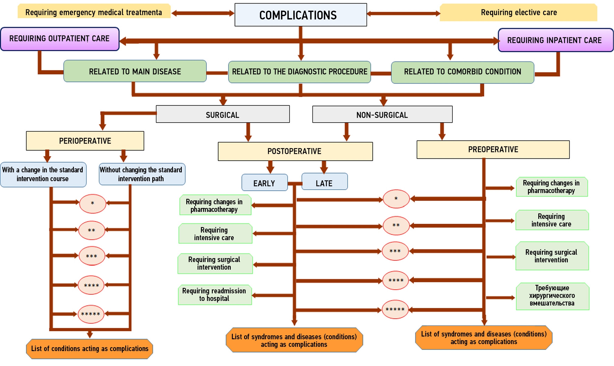 Nowadays, it is practically impossible to comparatively analyze complications at different time intervals in one or more medical institutions due to the lack of a unified standardized system for registering complications. Furthermore, it is important to consider almost exclusively postoperative complications or complications directly related to surgical intervention when assessing the outcomes and quality of treatment, while complications can also potentially be associated with diagnostic procedures, pharmacotherapy, and the unfavorable course of concomitant diseases. Additionally, although the proportion of these complications is significantly less, they contribute to the efficiency of the diagnostic and treatment process, whether it is the preoperative period, the time of the immediate surgical procedure, or the postoperative course in the early and long-term periods.