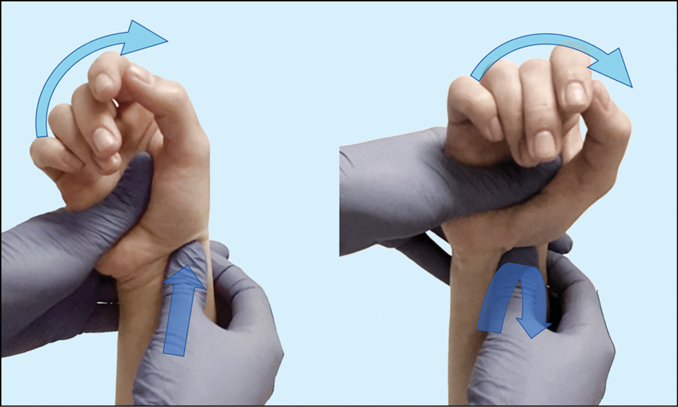 Рис. 1. Тест Watson: отведение кисти из локтевой девиации в лучевую с постоянным давлением на дистальный полюс ладьевидной кости