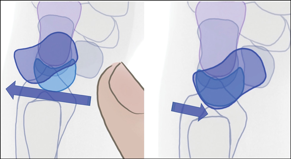 Рис. 2. Тест Watson: тыльное смещение ладьевидной кости при давлении на дистальный полюс и устранение смещения при прекращении давления