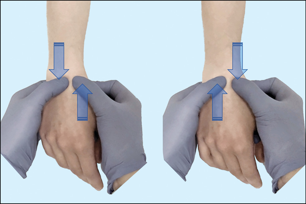 Рис. 3. Тест баллотирования ладьевидной кости: стабилизация полулунной кости пальцами одной руки и смещение ладьевидной кости в тыльную и ладонную стороны относительно полулунной кости