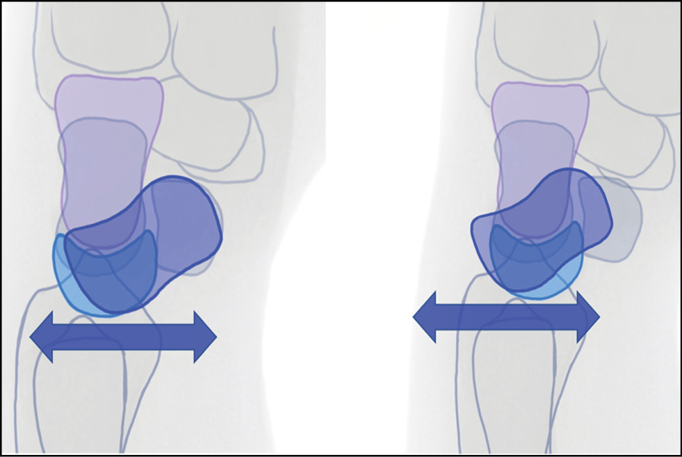 Рис. 4. Тест баллотирования ладьевидной кости: смещение ладьевидной кости в тыльную и ладонную стороны относительно полулунной кости
