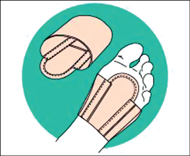 Приводим технологию применения: для выведения головок 2–4-й плюсневых костей из-под нагрузки, ленту разомкнутой манжеты подкладывали под передний отдел стопы так, чтобы карман оказывался выпуклой стороной обязательно под этими головками. После чего натягивали ленту и совмещали ее концы таким образом, чтобы поверхности «липучек» совпали и слиплись. Если необходимо, одновременно с этим дозированно стягивали передний отдел стопы до восстановления нормального размера поперечника, а локальным давлением вкладыша-пелота формировали поперечный свод.