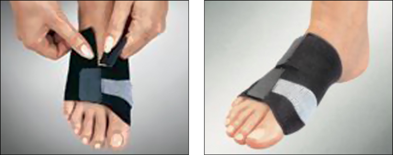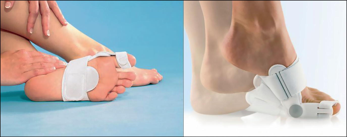 Условно к этой группе можно отнести еще несколько изделий: TAS Toe Alignment Splint (Darco, Германия) GmbH и Adjustable Bunion DaySplint; Hallux Valgus Softsplint (PediFix, США) (рис. 13, 14). Во всех трех имеется возможность коррекции положения пальца (в последнем в меньшей степени) и одновременного сближения плюсневых костей (то есть нормализация либо уменьшение поперечного размера). При этом отсутствие корригирующего пелота снижает эффективность конструкции. Другие характерные недостатки этих изделий такие же, как и у Hallufix.