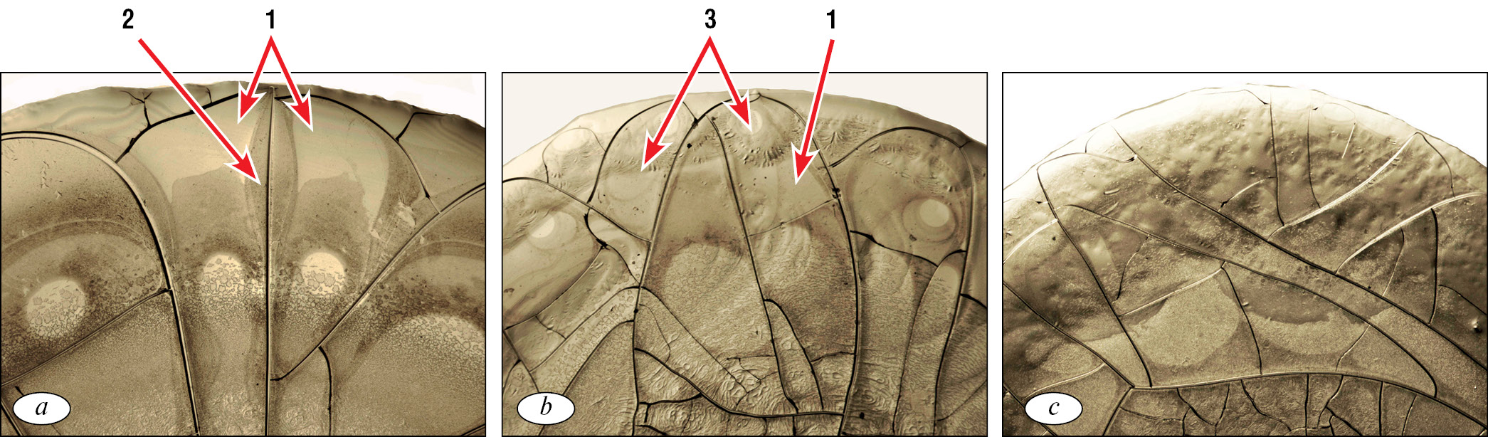 Рис. 1. Фрагменты фаций сыворотки крови пациентки К.: а (проба 1) — маркеры воспаления (стрелка 1) и склерозирования (стрелка 2); b (проба 2) — маркеры воспаления (стрелка 1) и маркеры умеренно выраженной деструкции — двойная фация, токсические бляшки (стрелка 3); с (проба 3) — маркеры выраженной деструкции и интоксикации (многослойная фация, смазанность структурных границ, потеря радиальной симметрии трещин). Микроскопия в обычном свете. Увел. ×50